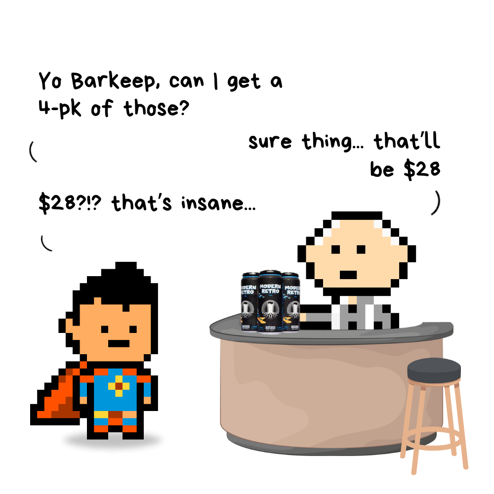 In our little cartoon above, we can see that the price of beer is in question. Most pubs charge around $7 for a pint. So if you have 4, the bill would be $28. Not crazy, and if that were your bill, you wouldn’t complain. You’d actually add around 20% for a tip.
